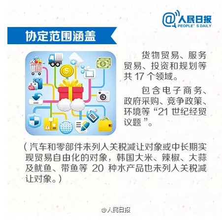中韓自貿(mào)協(xié)定生效后,中國將在最長20年內(nèi)實現(xiàn)零關(guān)稅的產(chǎn)品達到稅目的91%、進口額的85%,韓國零關(guān)稅產(chǎn)品達到稅目的92%、進口額的91%。協(xié)定范圍涵蓋貨物貿(mào)易、服務(wù)貿(mào)易、投資和規(guī)則共17個領(lǐng)域。雙方將以負(fù)面清單模式繼續(xù)開展服務(wù)貿(mào)易談判。