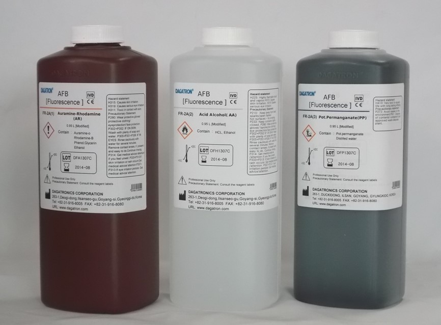顯微染色技術(shù)是檢測結(jié)核桿菌方法之一。分枝桿菌細(xì)胞壁中含有分枝菌酸,其可以與染料牢固結(jié)合,具有“抗酸性”的特征。熒光染料金胺-羅丹明在染色中與抗酸生物細(xì)胞壁內(nèi)的分枝菌酸相結(jié)合,并耐受酸醇(脫色劑)清洗脫色。反染色劑高錳酸鉀被用來顯出染色生物。AFB(熒光)染色試劑盒設(shè)計(jì)既可用于自動染色機(jī),也可用于手工染色。產(chǎn)品穩(wěn)定性好,染色效果佳。