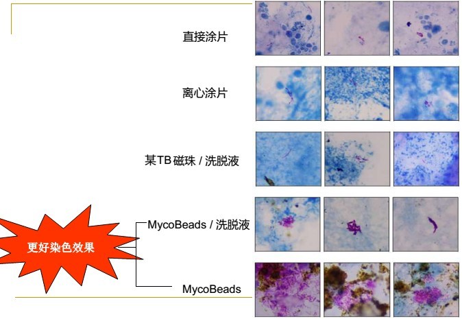1.MycoBeads分離后的結(jié)核分枝桿菌具有更好的染色效果--比傳統(tǒng)分離方法或相關(guān)產(chǎn)品比較