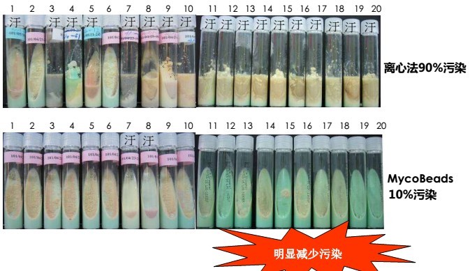 2.MycoBeads分離后的結(jié)核分枝桿菌經(jīng)培養(yǎng)具有更少的污染--與離心法分離法進(jìn)行比較