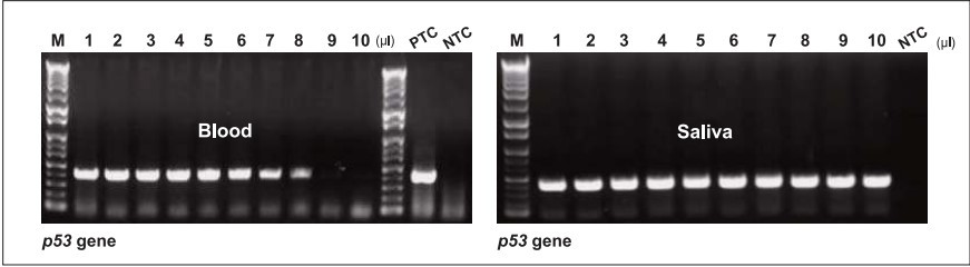 圖3.直接從全血和唾液樣本PCR結(jié)果。1~10指示的是全血或唾液樣本的體積(ul);PTC:純化的基因組DNA,10ng作為模板;NTC:陰性對(duì)照。