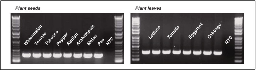 圖4. 直接從不同植物組織進(jìn)行PCR結(jié)果。PCR反應(yīng)使用葉綠素引物對(duì), NTC:陰性對(duì)照。