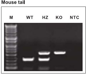 HZ:雜合型小鼠,KO:基因敲除小鼠(589bp),NTC:陰性對(duì)照。