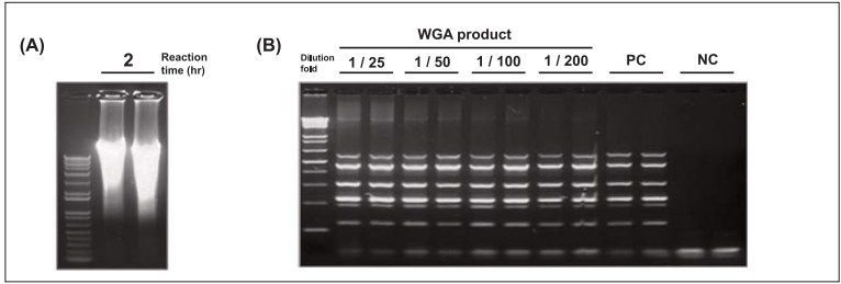 圖1. (A)HelixAmp 水稻組織直接基因組擴(kuò)增(WGA)試劑盒擴(kuò)增水稻全基因組。反應(yīng)條件為30℃溫育2h。(B)以HelixAmp擴(kuò)增產(chǎn)物做
