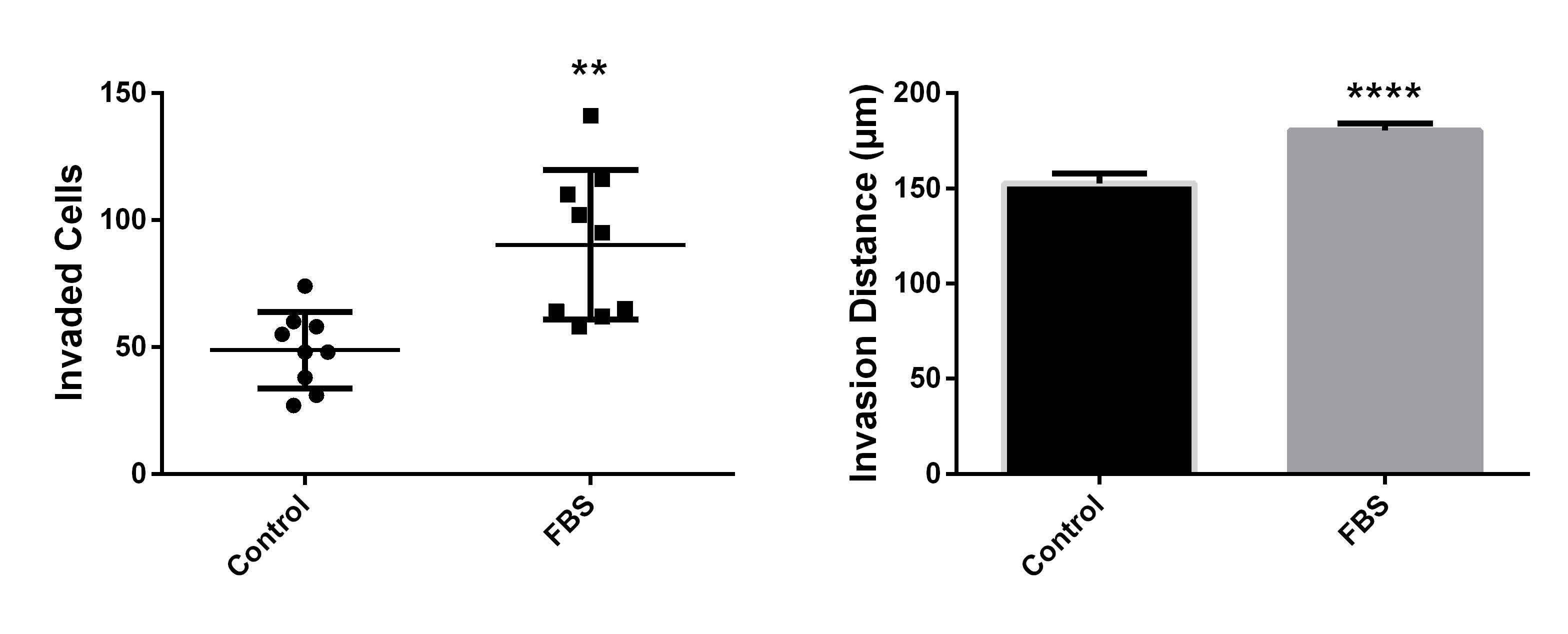 注:入侵細(xì)胞的數(shù)量可以很簡(jiǎn)便地通過計(jì)算選定區(qū)域的核數(shù)來確定。細(xì)胞遷移速度可以通過確定細(xì)胞在給定時(shí)間的遷移距離進(jìn)而很容易地被量化。