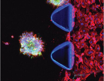(1)播散:癌細(xì)胞球體分布情況監(jiān)測(cè)用于建立發(fā)生在癌癥早期階段的轉(zhuǎn)移模型(EMT)。癌細(xì)胞球體可以被植入AIM芯片的3D水凝膠網(wǎng)絡(luò)中,而且可以和其他細(xì)胞(如內(nèi)皮細(xì)胞)共培養(yǎng)以便于更準(zhǔn)確地模擬腫瘤微環(huán)境。